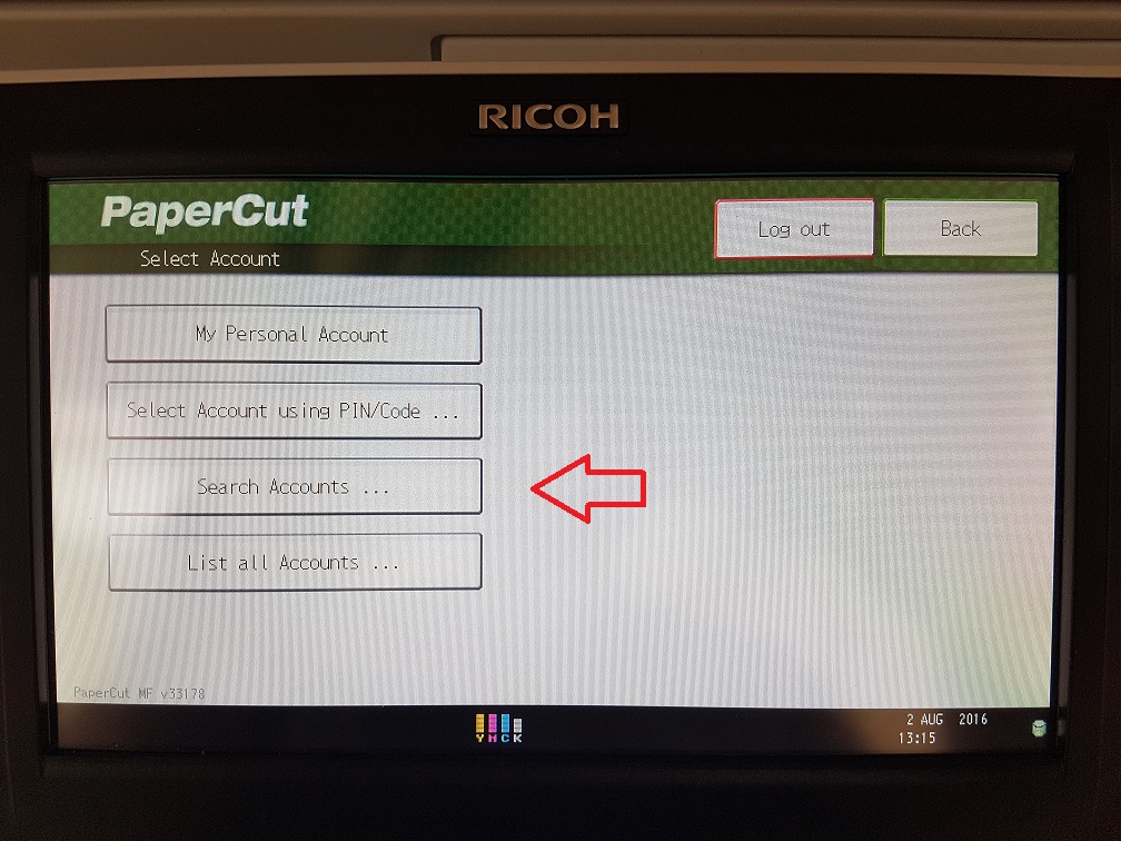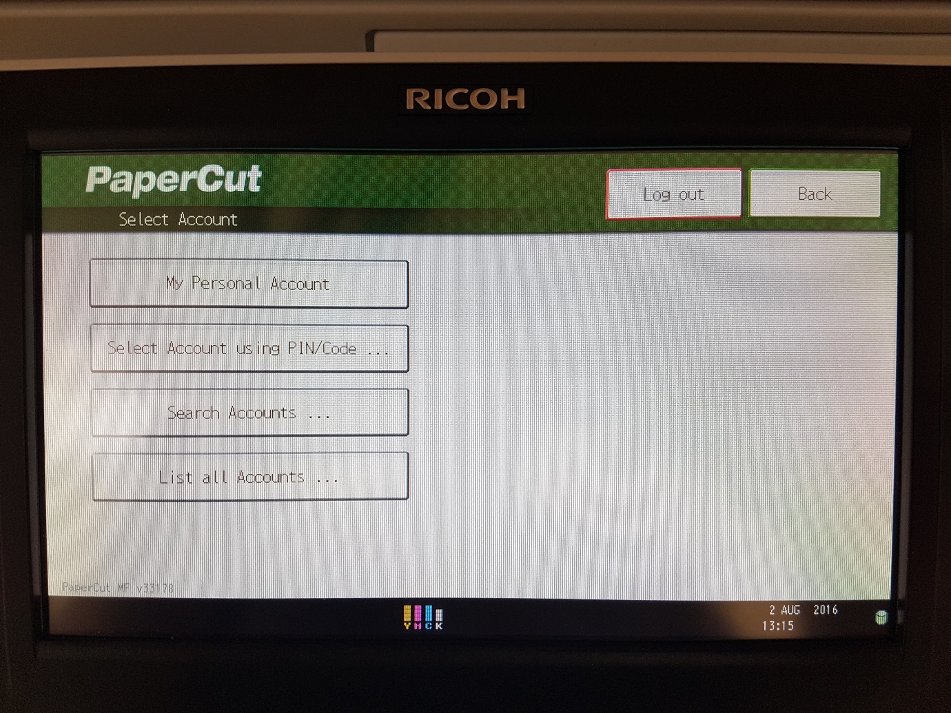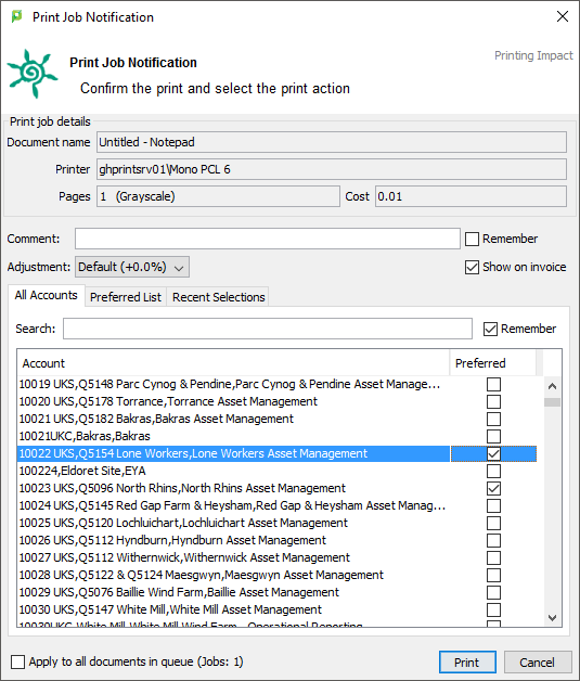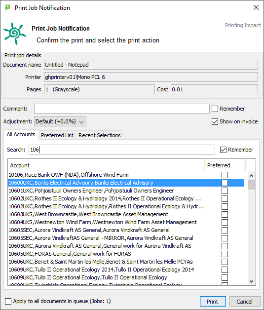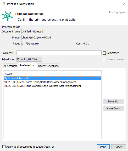 When you come to print, you will be presented with a pop up window where you can decide which account to register your print job against.